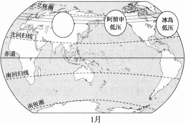(1)副极地低压带;亚洲高压;东亚:西北风;南亚:东北风