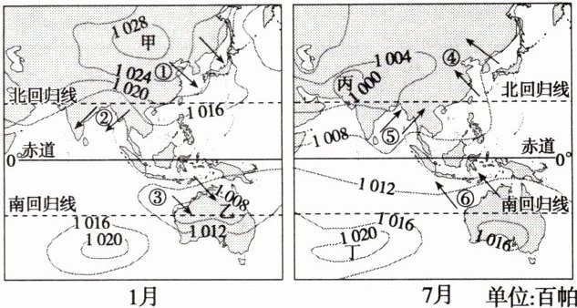 下图为世界部分区域1月和7月海平面气压分布图,①~⑥的箭头表示盛行风向。据此完成2~3题。