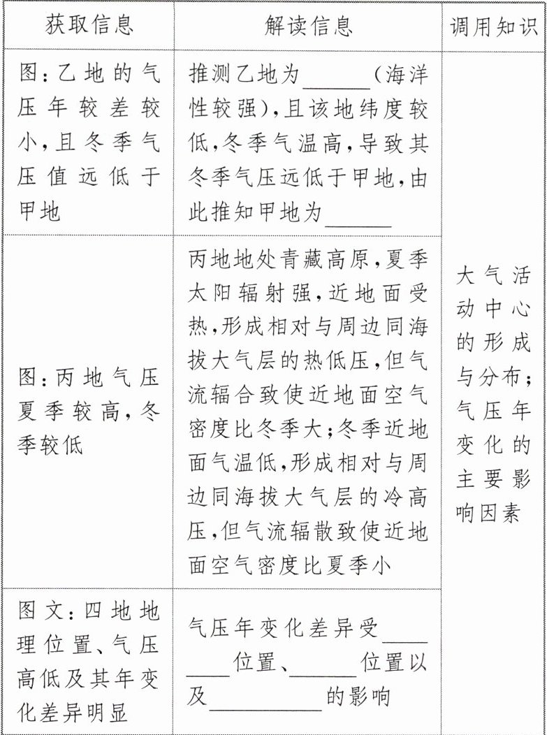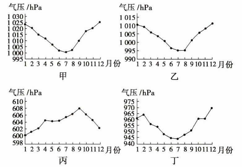 综合思维:结合图示信息(气压值的大小及各月变化),综合考虑影响气压季节变化的因素。