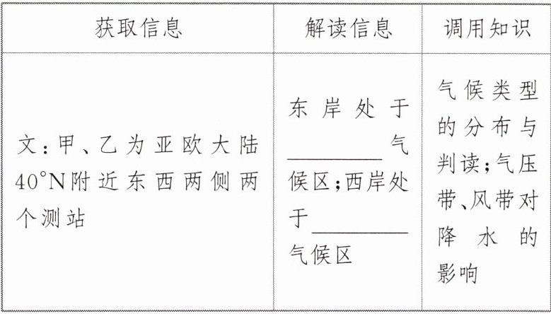 区域认知:根据气候资料,明确亚欧大陆 40°N 附近东西两侧气候类型的分布。