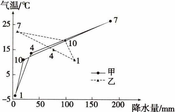 典例(经典高考题)下图为亚欧大陆 40°N 附近东西两侧两个测站 1、4、7、10 四个月的气候资料。据此完成(1)~(2)题。