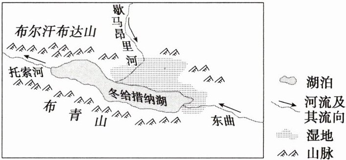 (2024·山东滨州模拟)冬给措纳湖地处青藏高原东北部,青海省布青山(昆仑山脉东段中支阿尼玛卿山的一段)、布尔汗布达山(昆仑山脉东段北支)之间,面积232.2 km²,湖面海拔4 090 m,年降水量约300 mm,年蒸发量约1 000 mm。冬给措纳湖拥有一大片湿地,在不同的季节,这里会呈现不同的色彩、不同的美。下图示意冬给措纳湖水系。据此完成1~2题。