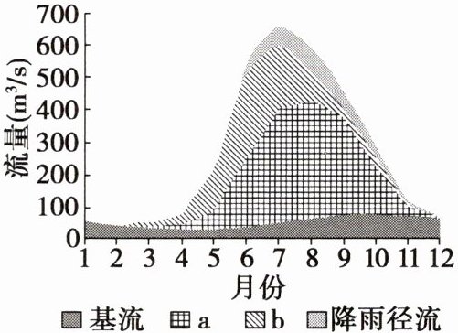 5.A 6.D 7.A 第5题,湖泊补给的特点是产生的径流较为稳定,由图可知,a、b径流都呈现了显著的季节变化,b径流形成时间较早,且在春季产生的径流量大于a径流,a径流形成时间晚,夏季产生的径流量大,故而a径流为冰川融水、b径流为积雪融水。第6题,读图可知,在11月~次年3月,其他方式径流均较少,基流所占比重最大,D正确。第7题,根据径流构成可知,该河流以冰川融水和积雪融水补给为主,且该地年均温为8.7℃,最高月均温16.4℃,最低月均温-0.2℃,年均温低而气温年较差小,符合青藏高原的气温特征。