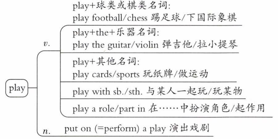 play 常用作动词,意为“参加(体育运动或球赛);玩耍;演奏;弹奏;扮演”;也可用作名词,意为“剧本,戏剧”。