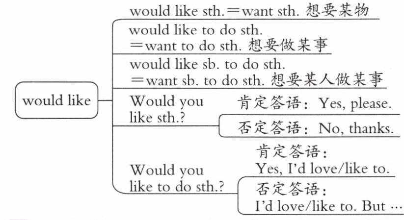 would like 意为“想要”,相当于 want,后跟名词或动词不定式作宾语。在陈述句中,would like 可与前面的主语缩写为 I'd like/we'd like 等。
