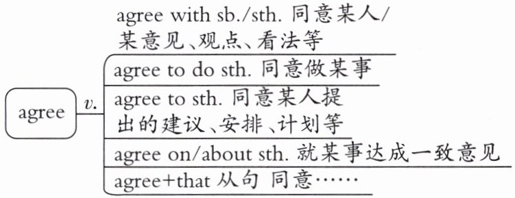 agree 意为“赞同”,其名词形式为 agreement,意为“协议;协定”,其反义词为 disagree。