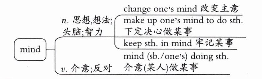 n. 思想,想法;头脑;智力 --> make up one's mind to do sth. 下定决心做某事