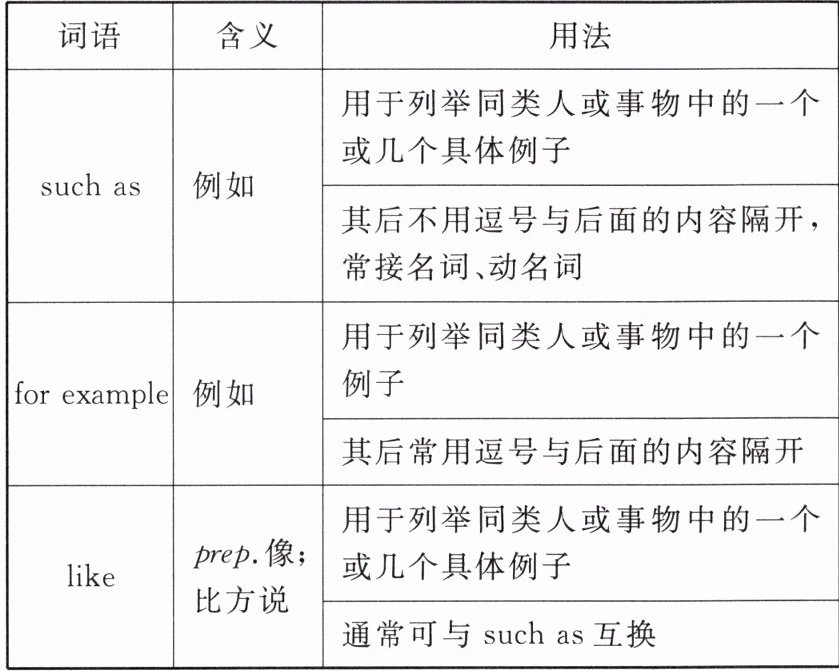 例 1. I like many subjects at school, such as English, maths and science. 在学校,我喜欢许多学科,比如英语、数学和科学。