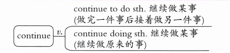 continue $ v. $ $\begin{cases} continue to do sth. 继续做某事 \\ (做完一件事后接着做另一件事) \\ continue doing sth. 继续做某事 \\ (继续做原来的事) \end{cases}$