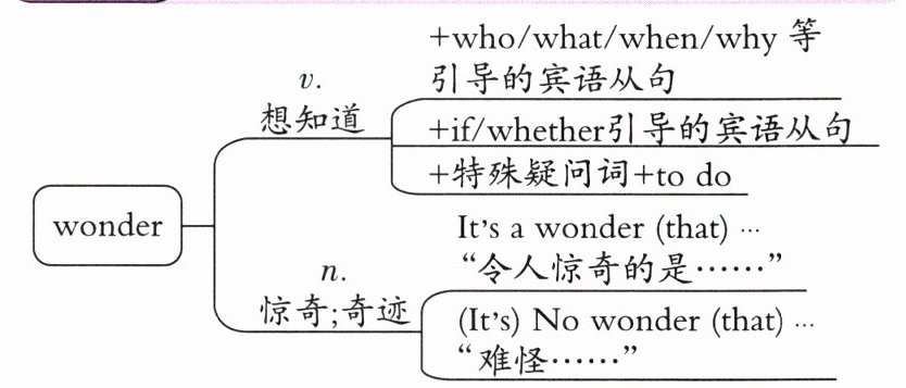 wonder $ \begin{cases} v. 想知道 \begin{cases} +who/what/when/why 等 \\ 引导的宾语从句 \\ +if/whether 引导的宾语从句 \\ +特殊疑问词+to do \end{cases} \\ n. 惊奇;奇迹 \begin{cases} It's a wonder (that)... \\ “令人惊奇的是……” \\ (It's) No wonder (that)... \\ “难怪……” \end{cases} \end{cases} $