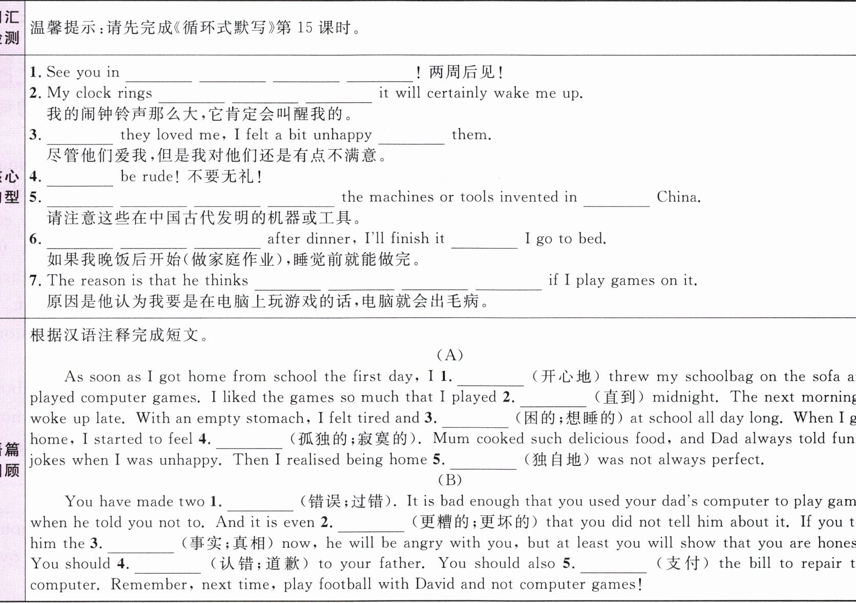 As soon as I got home from school the first day, I 1. ______(开心地)threw my schoolbag on the sofa and played computer games. I liked the games so much that I played 2. ______(直到)midnight. The next morning I woke up late. With an empty stomach, I felt tired and 3. ______(困的;想睡的)at school all day long. When I got home, I started to feel 4. ______(孤独的;寂寞的). Mum cooked such delicious food, and Dad always told funny jokes when I was unhappy. Then I realised being home 5. ______(独自地)was not always perfect.