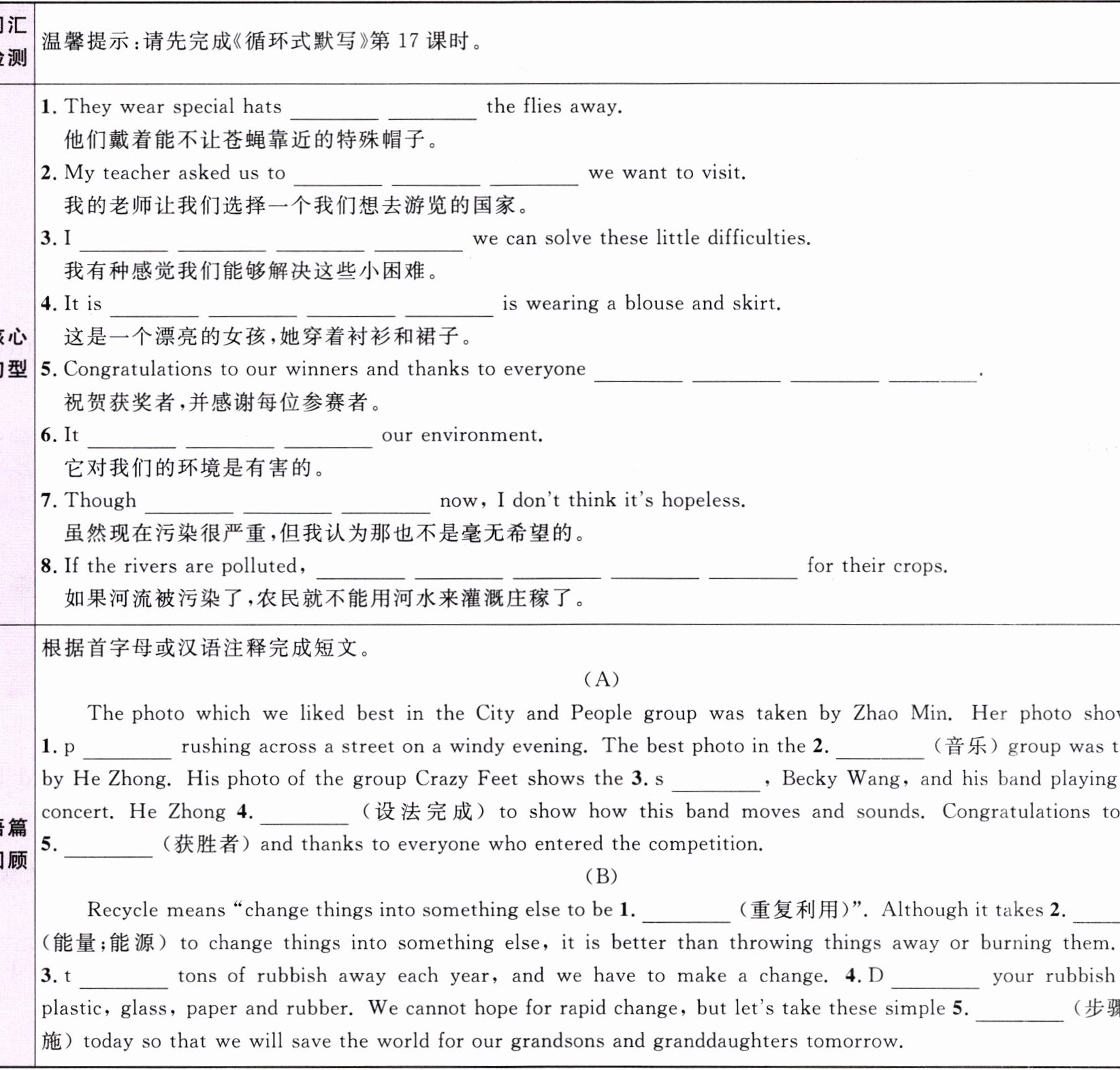 (A)1.person 2.Music 3.singer 4.manages 5.winners (B)1.reused 2.energy 3.throw 4.Divide 5.steps