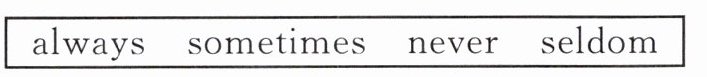 always/usually/often/sometimes/seldom/hardly/never 这些副词均表示频度,在句中的位置一般在实义动词之前,be 动词、助动词或情态动词之后。下图用百分比来表示频度副词所表示的频率高低: