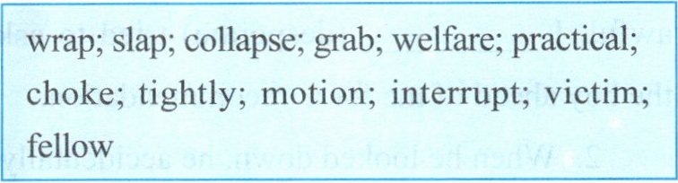 Knowing that choking 5. ________ usually only had about four minutes before they 6. ________ and sometimes died, Peter wasted no time. He went to Sam’s table immediately. Then, standing behind Sam, he began to perform the Heimlich manoeuvre, which is a very 7. ________ way of helping a person who’s choking. He 8. ________ his arms around Sam’s stomach, made a fist with one hand, and then 9. ________ it with his other hand 10. ________. Next, he pushed up and into Sam’s stomach in one 11. ________. He continued doing this until the food was finally forced out.