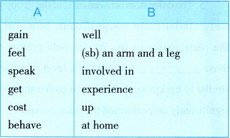 1. speak up 2. feels at home 3. behave well 4. get involved in 5. gain experience 6. cost them an arm and a leg