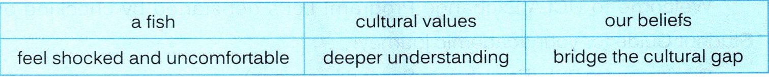 1. You are going to listen to a passage about bridging the cultural gap. Before listening, think about the items listed in the table below, all of which are taken from the recording. Predict what you might hear in the recording and then check if your predictions are right while listening.