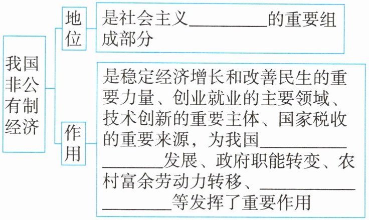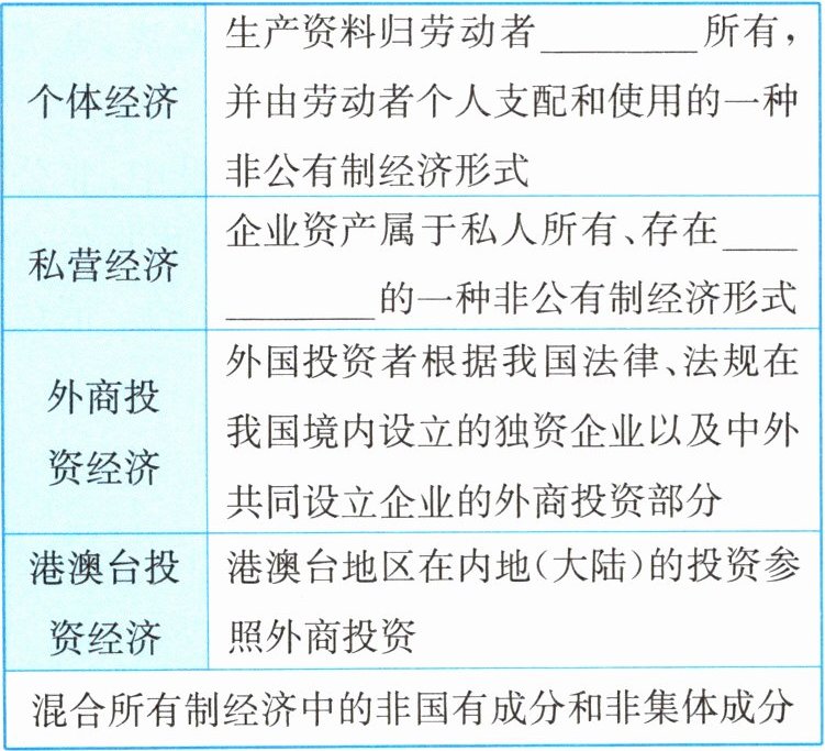 1. 在我国经济“百花园”中,各种经济成分争奇斗艳,多姿多彩。你知道其中哪些属于非公有制经济吗?阅读教材第6页,填写下面表格: