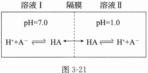 1. (2022·全国乙)常温下,一元酸HA的$K_{a}(HA)=1.0×10^{-3}$。在某体系中,$H^{+}$与$A^{-}$不能穿过隔膜,未电离的HA可自由穿过隔膜(如图3-21所示)。设溶液中$c_{总}(HA)=c(HA)+c(A^{-})$,当达到平衡时,下列叙述正确的是( )。