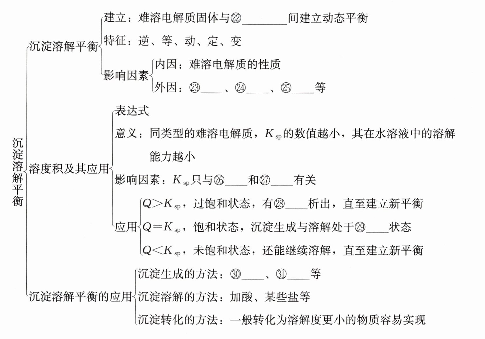 ㉒溶解的离子 ㉓溶液酸碱性 ㉔某些盐 ㉕温度 ㉖难溶电解质的性质 ㉗温度 ㉘沉淀 ㉙平衡 ㉚加沉淀剂 ㉛调节溶液的pH