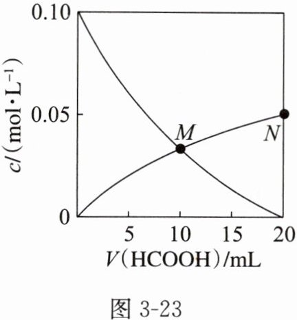 3. (2024·湖南)常温下$K_{a}(HCOOH)=1.8×10^{-4}$,向$20mL0.10mol/LNaOH$溶液中缓慢滴入相同浓度的$HCOOH$溶液,混合溶液中某两种离子的浓度随加入$HCOOH$溶液体积的变化关系如图3-23所示,下列说法错误的是( )。