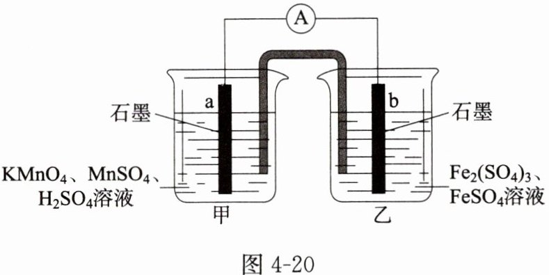 3. 图 4 - 20 所示原电池装置的盐桥中装有饱和 ${K_{2}SO_{4}}$ 溶液,电池工作一段时间后,甲烧杯中溶液颜色逐渐变浅。下列叙述正确的是( )。