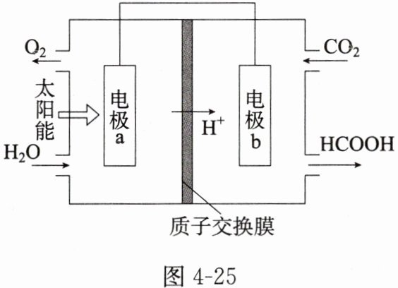9. (1)将煤燃烧产生的二氧化碳回收利用,可达到低碳排放的目的。图 4 - 25 是通过人工光合作用,以 ${CO_{2}}$ 和 ${H_{2}O}$ 为原料制备 ${HCOOH}$ 和 ${O_{2}}$ 的原理示意图。电极 ${b}$ 作____极,电极表面发生的反应为____。