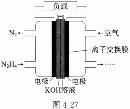 (3)一种以肼(${N_{2}H_{4}}$)为液体燃料的电池装置如图 4 - 27 所示。该电池用空气中的氧气作氧化剂,${KOH}$ 溶液作电解质溶液。