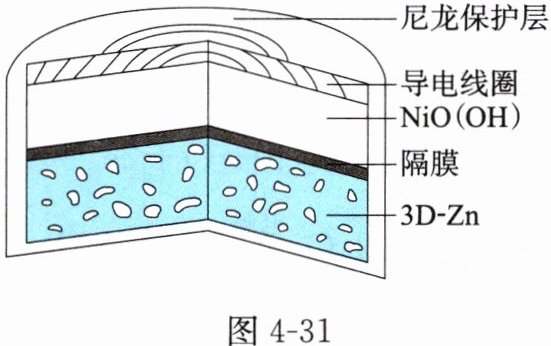 【例题 2】为提升电池循环效率和稳定性,科学家利用三维多孔海绵状 Zn(3D - Zn)可以高效沉积 ZnO 的特点,设计了采用强碱性电解质的 3D - Zn - NiO(OH) 二次电池,结构如图 4 - 31 所示。电池反应为 $Zn(s) + 2NiO(OH)(s) + H_2O(l) \stackrel{放电}{\underset{充电}{\rightleftharpoons}} ZnO(s) + 2Ni(OH)_2(s)$。
