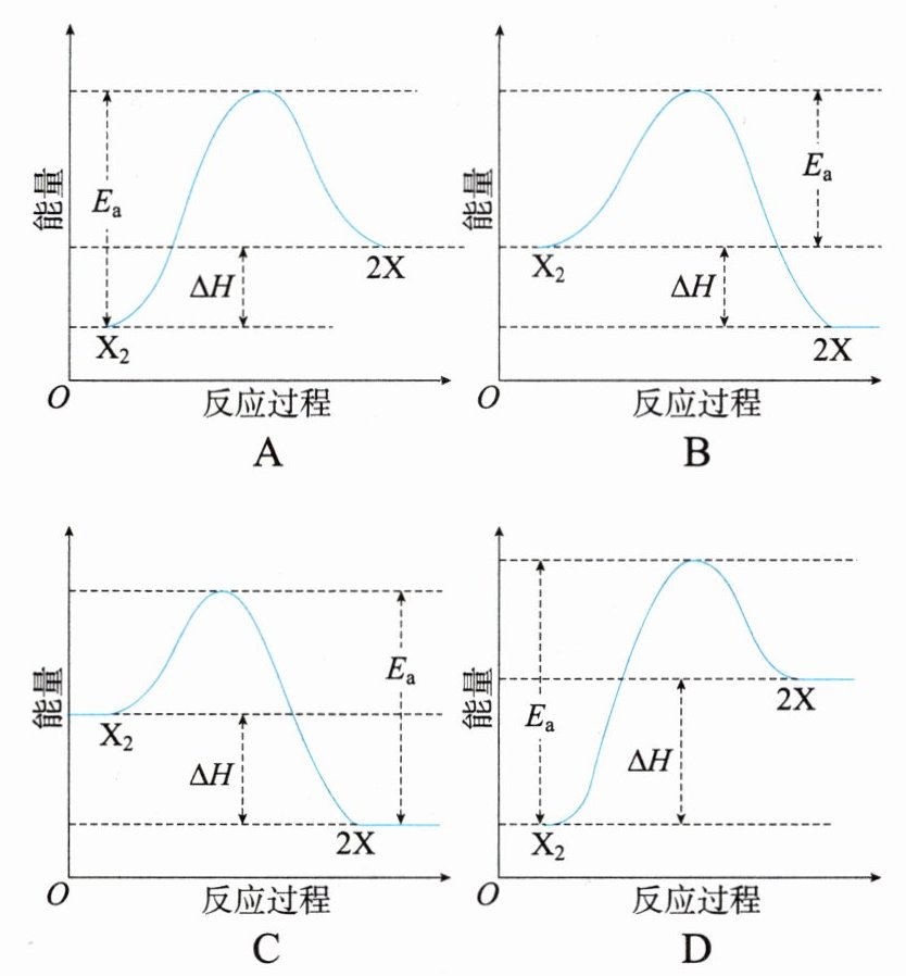 5. 某物质(用X₂表示)在正庚烷溶剂中发生反应X₂$\rightleftharpoons$2X,测得该反应的$\Delta H=+50.5kJ/mol$,活化能$E_{a}=90.4kJ/mol$。下列能量关系图合理的是( )。