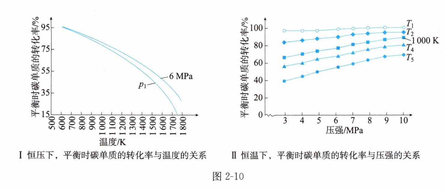 在1L密闭容器中投入1mol碳单质,并充入$2mol H_{2}$,测得平衡时碳单质的转化率与温度、压强的关系如图2-10所示。