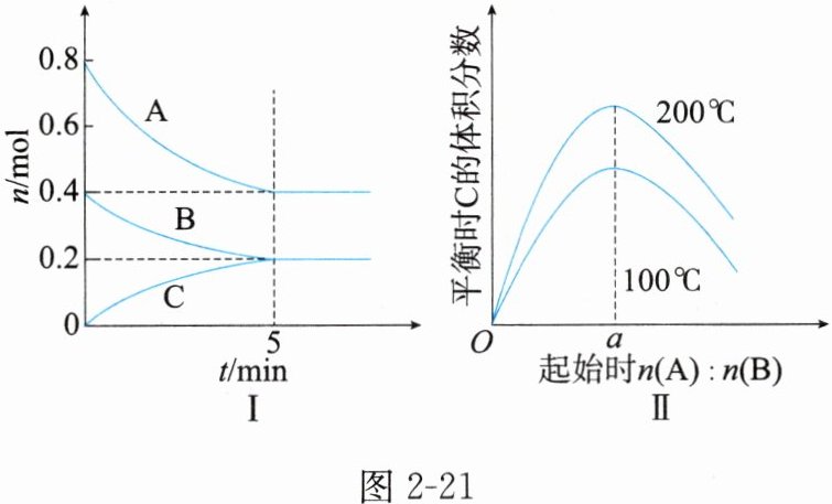 10. 在容积为2L的恒容密闭容器中发生反应$xA(g) + yB(g)\rightleftharpoons zC(g)$,图2-21Ⅰ表示$200^{\circ}C$时容器中$A$、$B$、$C$的物质的量随时间的变化,图2-21Ⅱ表示不同温度下平衡时$C$的体积分数随起始$n(A):n(B)$的变化关系。下列结论正确的是( )。