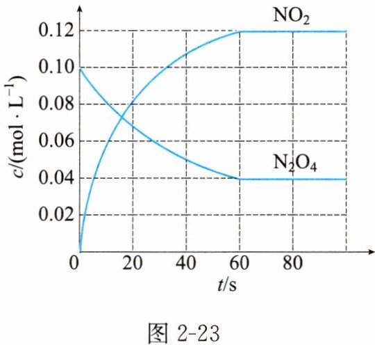 (1) 该反应的$\Delta H$________(填“$>$”或“$<$”)0。$100^{\circ}C$时,体系中各物质的浓度随时间变化如图2-23所示。在0~60s,$v(N_{2}O_{4})$为________$mol/(L·s)$,反应的平衡常数$K_{1}=$________。