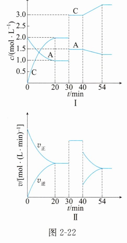 12. 已知反应$A(g) + xB(g)\rightleftharpoons 2C(g)$,在密闭容器中充入等物质的量的气体$A$和$B$,达到平衡后,只改变一个反应条件,测得容器内有关物质的浓度,正、逆反应速率随时间的变化关系分别如图2-22Ⅰ、图2-22Ⅱ所示。
