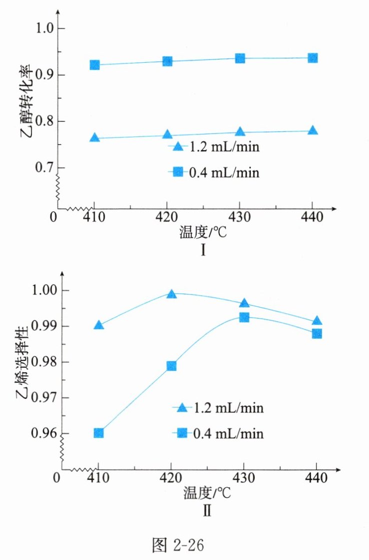 在催化剂作用下用乙醇制乙烯,乙醇转化率和乙烯选择性(生成乙烯的物质的量与乙醇转化的物质的量的比值)随温度、乙醇进料量(单位: $ {mL/min} $)的关系如图 2 - 26 所示(保持其他条件相同)。在 $ 410 \sim 440\ {^{\circ}C} $ 时,下列说法不正确的是( )。
