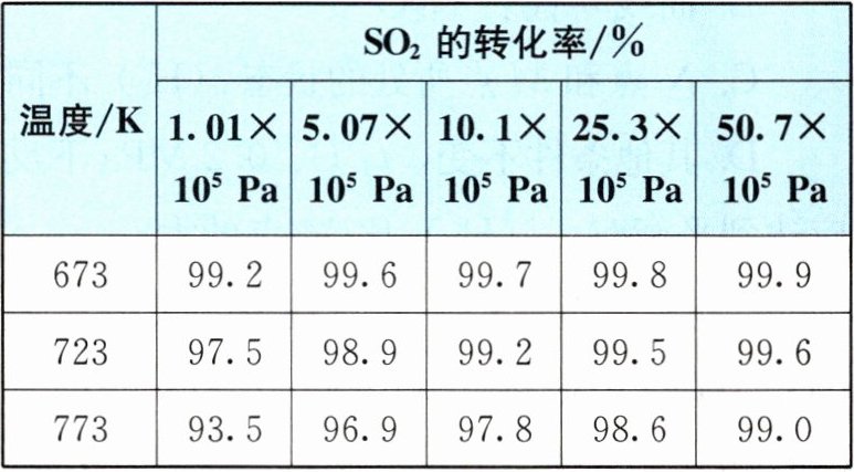 5. 已知 $ {2SO_{2}(g) + O_{2}(g)\rightleftharpoons 2SO_{3}(g)} $ $ \Delta H = - 197.8\ {kJ/mol} $。起始反应物为 $ {SO_{2}} $ 和 $ {O_{2}} $,其物质的量之比为 $ 2:1 $,且总物质的量不变。平衡时 $ {SO_{2}} $ 的转化率随温度和压强的变化如下表所示: