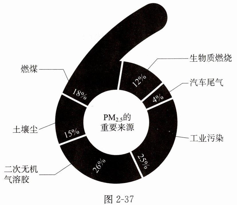 10. 某研究所通过对北京地区 $ {PM_{2.5}} $ 的化学组成及来源的季节变化研究发现,北京 $ {PM_{2.5}} $ 有 6 个重要来源,其中汽车尾气和燃煤分别占 $ 4\% $、 $ 18\% $(如图 2 - 37 所示)。