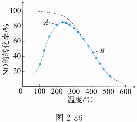 9. 在恒压、 $ {NO} $ 和 $ {O_{2}} $ 的起始浓度一定的条件下,在催化剂作用下反应相同时间,测得不同温度下 $ {NO} $ 转化为 $ {NO_{2}} $ 的转化率如图 2 - 36 中实线所示(图中虚线表示相同条件下平衡时 $ {NO} $ 的转化率随温度的变化)。