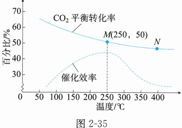 8. 一定条件下合成乙烯的反应为: $ {6H_{2}(g) + 2CO_{2}(g)\rightleftharpoons CH_{2}=CH_{2}(g) + 4H_{2}O(g)} $。已知温度对平衡时 $ {CO_{2}} $ 的转化率和催化剂催化效率的影响如图 2 - 35 所示,下列说法不正确的是( )。