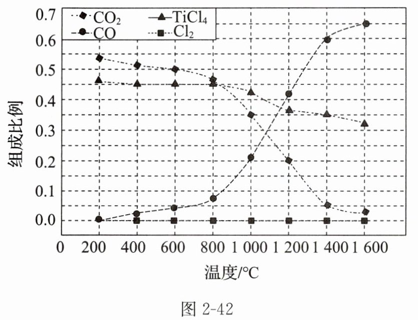(2)在$1.0 × 10^{5}\ Pa$时,将${TiO_{2}}$、${C}$、${Cl_{2}}$以物质的量比$1:2.2:2$进行反应。体系中气体平衡组成比例(物质的量分数)随温度变化的理论计算结果如图2-42所示。