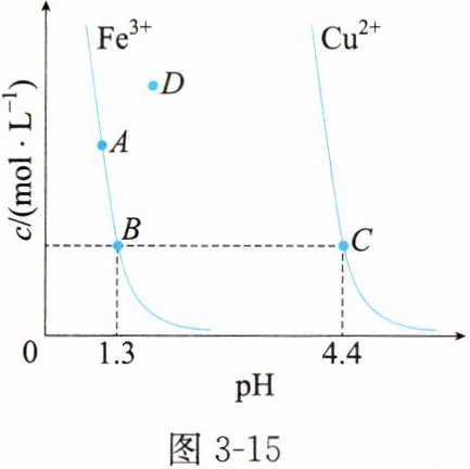 【例题 2】常温下,$Fe(OH)_{3}$和$Cu(OH)_{2}$的沉淀溶解平衡曲线如图 3 - 15 所示。下列有关说法正确的是( )。
