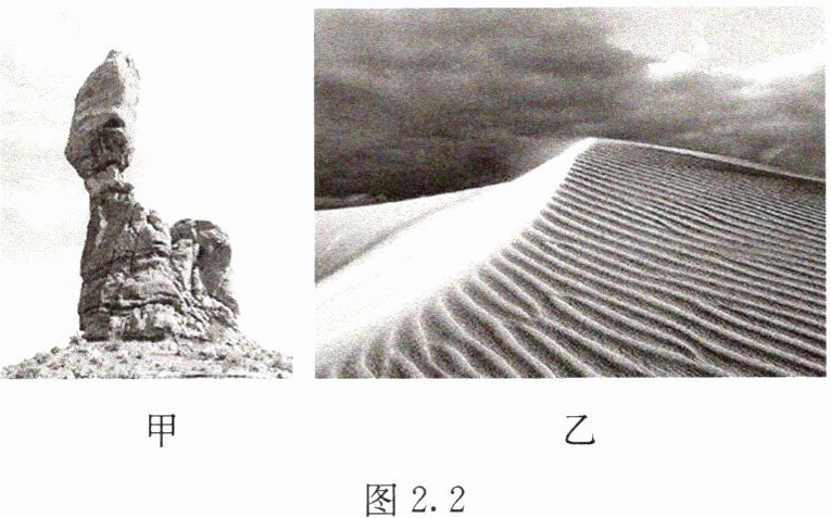 (1)从外力作用的角度来看,图2.2中形成甲地貌的主要外力作用有____和侵蚀;形成乙地貌的主要外力作用是____,其能量主要来自地球外部的____能。