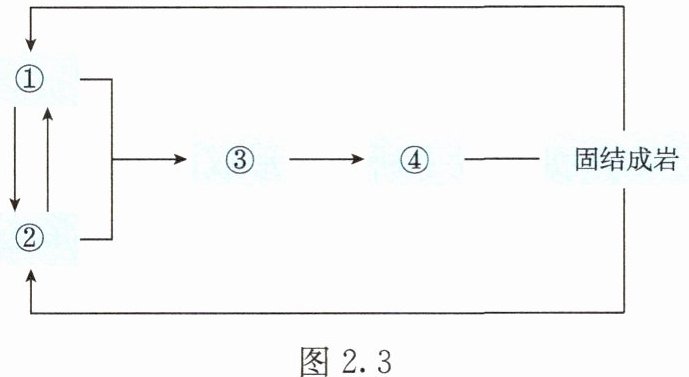 (2)图2.3是风化、侵蚀、搬运、堆积作用的相关示意图,填写对应的外力作用。