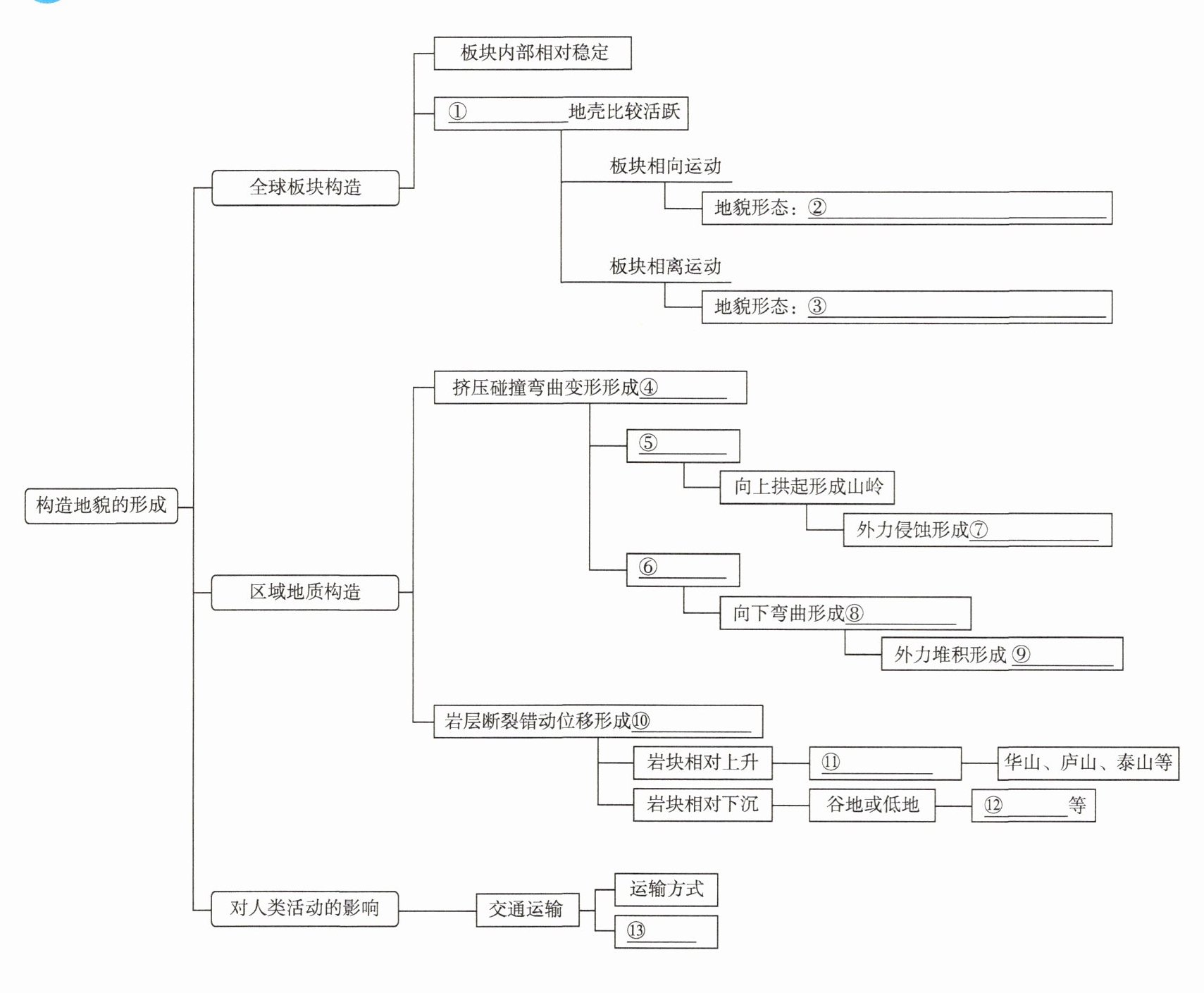 知识梳理 ①板块交界处 ②巨大山系、海沟、岛弧等 ③裂谷、海洋 ④褶皱 ⑤背斜 ⑥向斜 ⑦背斜谷 ⑧谷地 ⑨向斜山 ⑩断层 ⑪断块山或高地 ⑫渭河平原、汾河谷地 ⑬交通线路