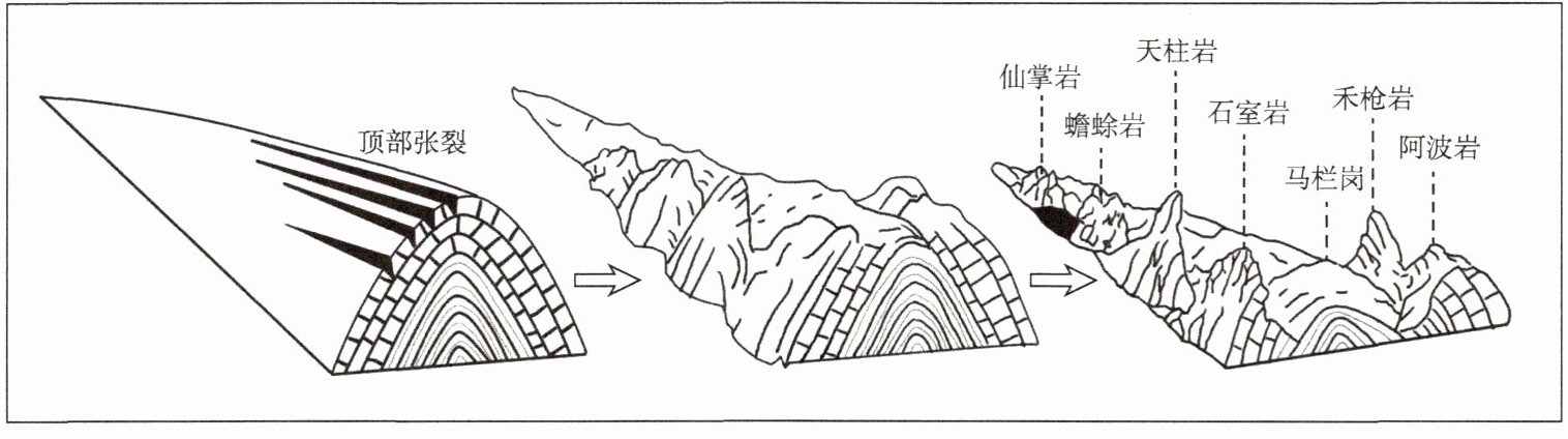 (3)广东肇庆七星岩由两列石灰岩山地组成,它们散落在一片湖光碧水中,宛如天上的北斗七星。图2.9为其发育过程的三个阶段,运用所学知识描述七星岩的形成过程。