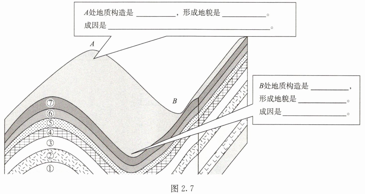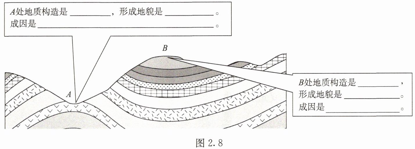 (2)经过外力长期作用,图2.7中的地貌可能会发生改变,据此完成图2.8中的相关内容。