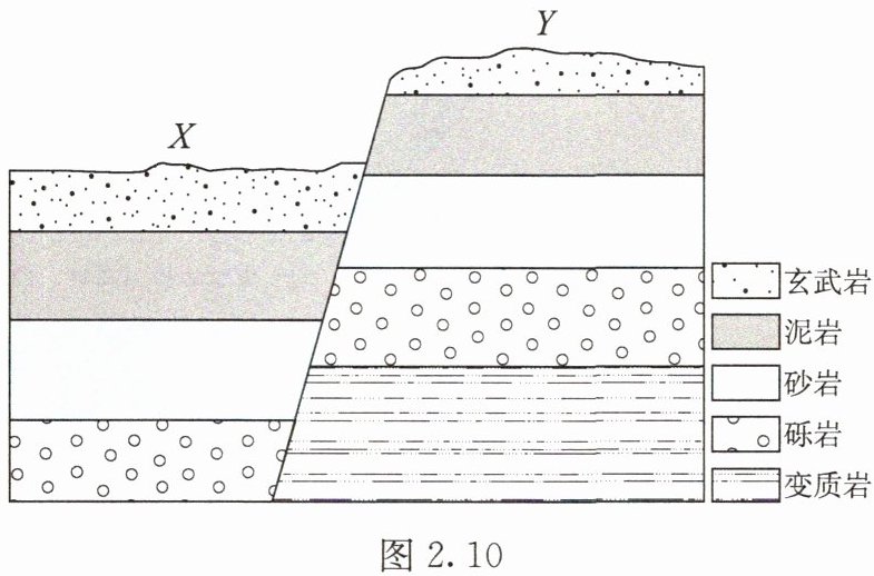 图2.10为某中学地理兴趣小组在野外考察时所绘制的区域地质剖面图。该区域由地表平坦的X区和地表略有起伏的Y区组成。X区的玄武岩岩层较厚,Y区的玄武岩岩层较薄。据此完成下列要求。