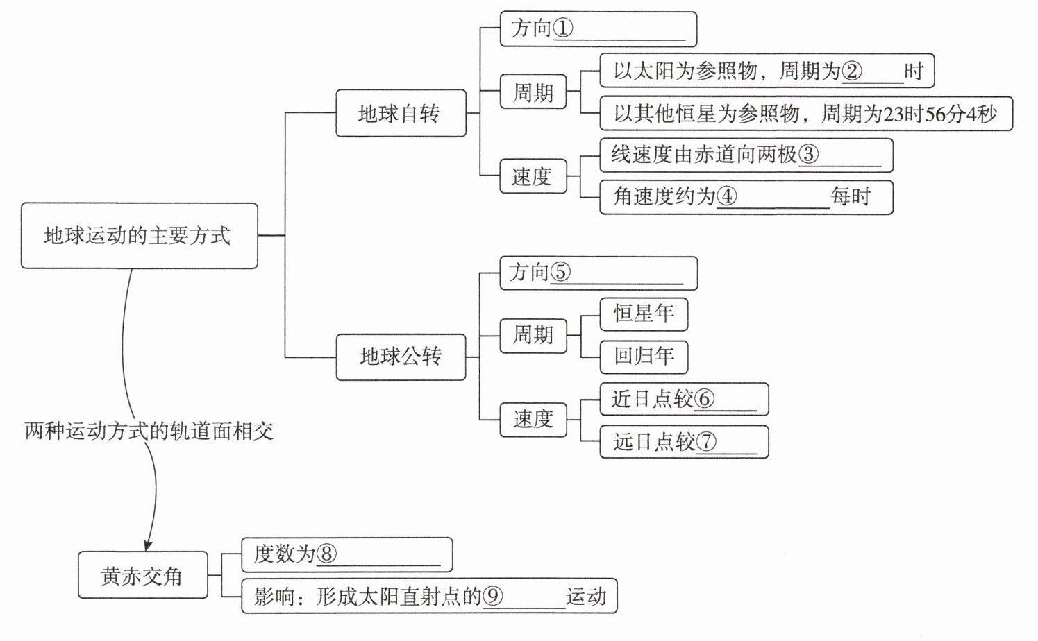 知识梳理 ①自西向东 ②24 ③递减 ④15° ⑤自西向东 ⑥快 ⑦慢 ⑧23°26′ ⑨回归