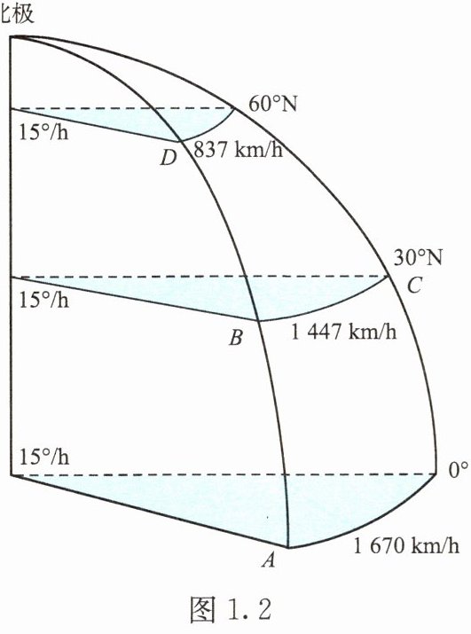 (3)地球自转的角速度除南北两极点外,处处相等,均约为______。地球自转的线速度随着纬度的增加而逐渐______,到南北两极点线速度为______。因此,图1.2的A、B、C、D四点中,线速度最小的是______,线速度相等的两点是______和______,四点中与诗句“坐地日行八万里,巡天遥看一千河”最相吻合的地点是______。