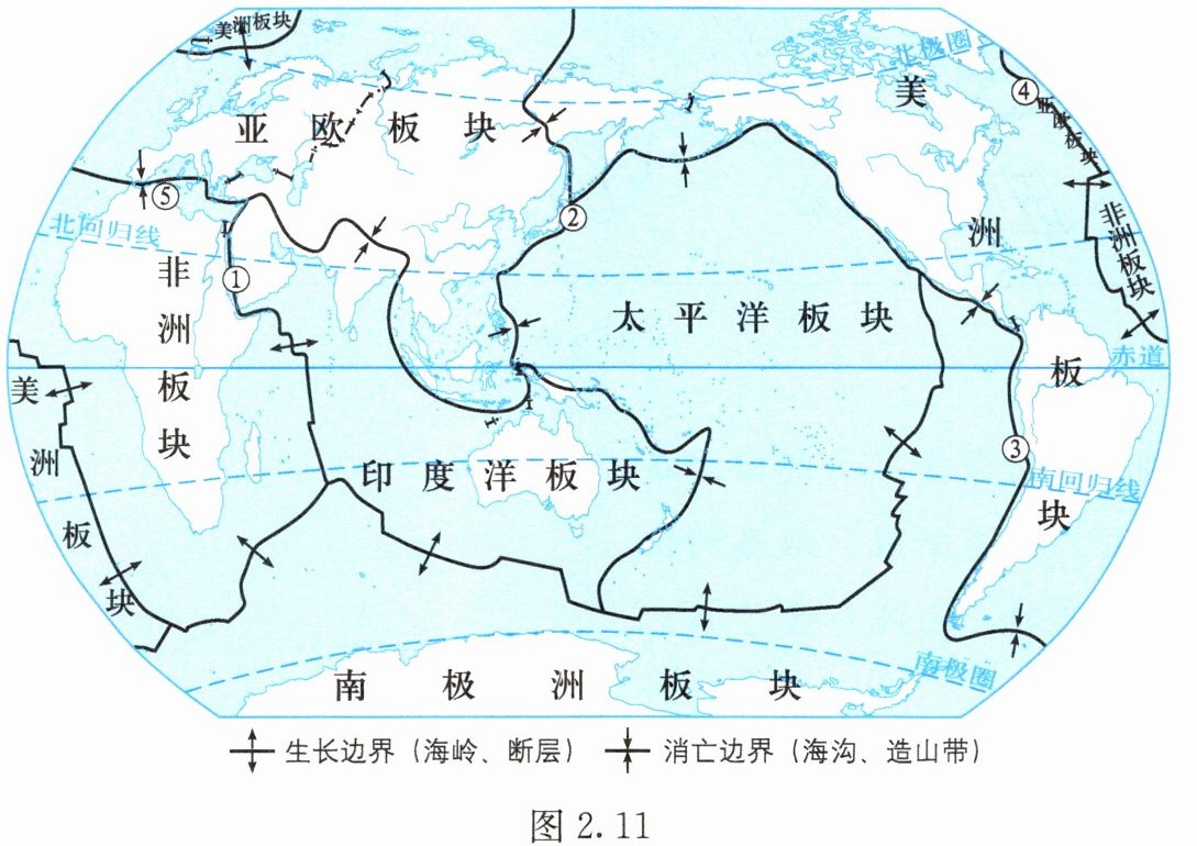 (2)图2.11中②处自北向南由日本群岛、台湾岛、菲律宾群岛等形成一串岛弧链,运用板块构造学说解释其形成原因。