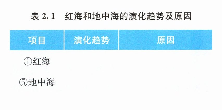(3)填写表2.1,运用板块构造理论,推测①红海和⑤地中海的发展演化趋势。